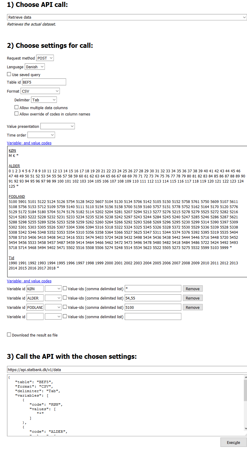 - Ladda hem en tabell: https://api.statbank.dk/v1/data