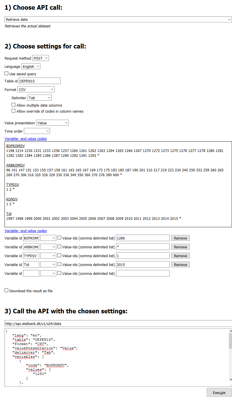 Om man vill öppna konsolen som gäller den svenska/engelska versionen av Öresundsdatabasen används http://api.statbank.dk/s24/console, om man istället vill använda den danska/engelska varianten används http://api.statbank.dk/s23/console. Maunualen till API:et hittar du här.